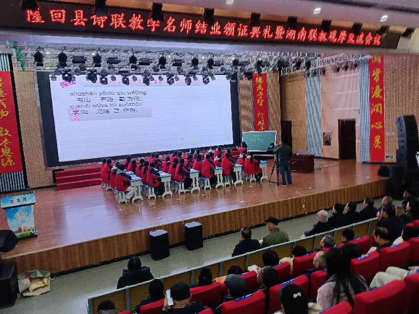 上午,隆回县百名诗联教学名师结业颁证典礼在隆回思源学校多功能厅隆重举行。湖南省楹联家协会教育委员会副主任、隆回县教育基金会理事长夏亦中介绍:湖南自2020年6月在邵阳岩口铺启动楹联教学种子名师孵化工程以来,全省各地在发现联教人才、培养联教骨干方面想办法、找路子,做了大量工作。邵阳市隆回县高度重视,从2022年起在全县中小学开展“以联育人、以诗润心”活动,实施了诗联教学百名名师培养计划。通过三年多的持续努力,最终由县教育局、教育基金会组织验收,从开始报名的386名教师中遴选出110名授课优胜者授予诗联教学名师证。隆回县委常委、宣传部长刘琴在讲话中充分肯定隆回联教取得的辉煌成果,代表县委、县政府表态将进一步支持联教工作,为传统楹联文化在新时代的创新发展贡献隆回力量。